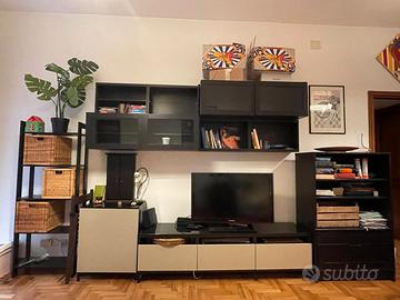 Vendo per trasloco una parete attrezzata completa, composta da moduli IKEA BESTA e librerie laterali coordinate.