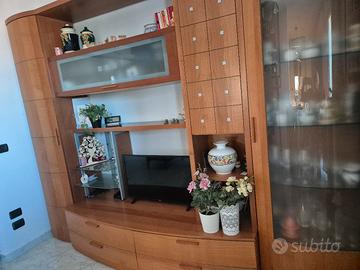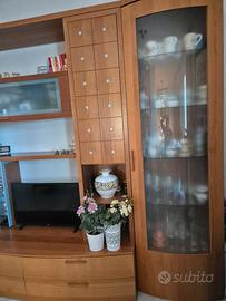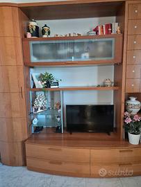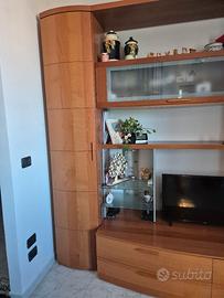 Parete attrezzata in legno ciliegio con 4 cassetti, anta con ripiani in cristallo e anta libreria, misure: larghezza cm 300, altezza cm 230. Condizioni ottime
