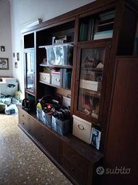 Parete attrezzata in legno massello. Può essere usata come libreria, oppure come vetrinetta, o come mobile salotto. È molto versatile. Presenta dei graffi come da foto. Si vede che è stata usata molto ma con un tocco di pennello torna come nuova.