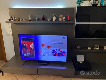 Vendo parete attrezzata completa in ottime condizioni, dal design moderno e lineare, composta da base TV, mensole e pensili contenitori con apertura a ribalta.