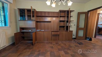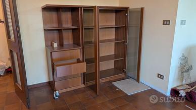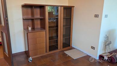 Parete attrezzata con ante in vetro, cassetti e ripiani finitura in legno. Larghezza complessiva 350cm altezza 210cm e profondità 44cm. Organizzato con ante in vetro, cassetti e parti chiuse. Molto solido ed in ottime condizioni. 150€ Abbinabile a secondo elemento con stesse finiture largo 150cm alto 140cm e profondità 44cm. 70€