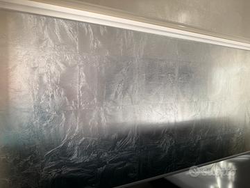 .Mobile tv, parete attrezzata color bianco laccato lucido. Cornice in eco pelle, il fondo dietro la TV è in foglia argento. Stile moderno- contemporaneo dà un tocco Elegante e raffinato all’ambiente. Tenuta benissimo. Disponibile a vederla dal vivo per chi è di zona . Si valutano offerte purché ragionevoli.