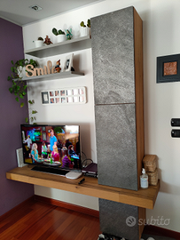 Vendo parete attrezzata sospesa Mobilgam, bellissima, composta da mensolone con passafili (180*45), cubotto (40*40*35), colonna (160*40*35), gli sportelli sono rivestiti con una lamina in pietra che ha un effetto molto bello perché crea dei riflessi particolari della luce. Mensoline interne in vetro, 2 mensole (90*28) colore grigio polvere e grigio cenere. Vendo per trasloco in altra casa. È in ottime condizioni