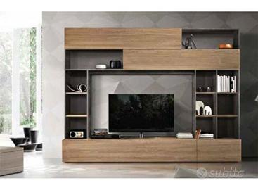 Parete attrezzata Mod Pratiko disponibile in 2 colorazioni cemento chiaro ed ossido - noce e stelvio Misure: L. 277 - P.42 H. 211 - Vano TV: L. 169 - P. 38 - H. 103