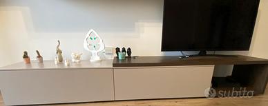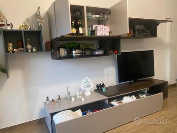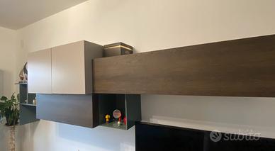 Parete attrezzata italiana pari al nuovo di ottima fattura, con cerniere robuste e ante spesse 2 cm. singoli moduli superiori assemblabili a proprio piacimento colori tortora,noce scuro e verde petrolio, base 290 x 45x 51,5 cm, modulo alto cosi composto cone foto 350x95x52, nel dettaglio singoli moduli superiori componibili:
