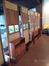 parete attrezzata modulare con ruote composta da 6 moduli con fioriere ambo i lati e cassettiera, interamente in legno di faggio e sughero progettata ,e costruita da specialista artigiano.adatta a separare ambienti rustici ,tavernette . dimensioni: pannelli latgh cm 90.... altezza cm 245 ... massimo ingombro da fioriera cm 60.