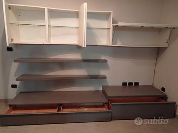 Parete attrezzata Napol, grigia e bianca, in ottime condizioni. La vetrinetta è dotata di dispositivo illuminante. I pensili bianchi e le mensole formano un'onda. Lunghezza complessiva della parete 3 m e 6 cm. per maggiori dettagli vedi foto scheda tecnica allegata.