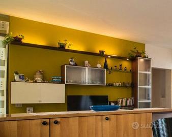 Vendo per cambio abitazione parete attrezzata brand TOMASELLA in legno di noce nazionale molto capiente, con sei cassettoni e vetrine come da foto, con mensolone illuminato sopra e sotto, componibile a piacere, la composizione in foto misura cm 315x210.