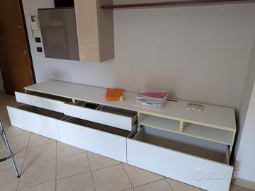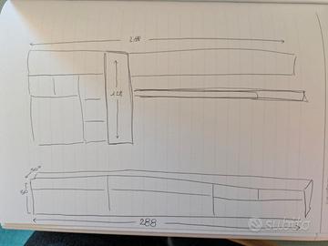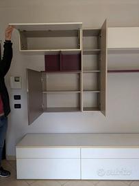 Vendo parete attrezzata modulare. Smontaggio e trasporto a carico dell'acquirente. Colori dei moduli: bianco, beige, marrone castagna e prugna. Rispetto alla foto, come si può vedere dal disegno del progetto, si possono aggiungere due ulteriori moduli libreria dello stesso colore (prugna) della mensola e del modulo già montato. Lunghezza complessiva 288cm. I mobili sono in buono stato