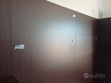 Parete attrezzata in legno di dimensioni 280 x 200 x 68 cm, con 2 ampi cassetti scorrevoli, 2 vani con apeetura ad anta (di cui uno specchiato) e 2 ripiani. Finitura elegate laccata e legno wengé. Smontato e pronto per il trasporto. Ritiro a carico dell'acquirente.