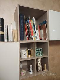 Parete Attrezzata di colore bianco e noce chiaro, due cassettoni, due scomparti, piccola libreria, base porta TV
