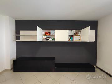 Parete attrezzata completa della prestigiosa marca Pianca, in ottime condizioni pari al nuovo in legno laccato nero e bianco, la lunghezza totale è di 4 metri lineari ed è composta da 4 pezzi: