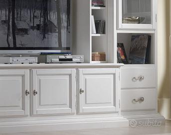 Parete attrezzata con finitura in laccato bianco, stile classico elegante.
