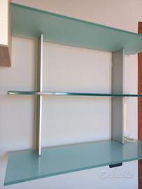 parete attrezzata composta da una base con due cassettoni, tre mensole a parete in vetro, pensile sospeso.