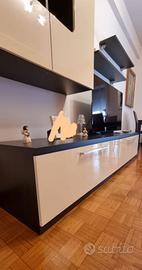 vendo mobile TV cme da foto lunghezza 2,44 m, con due mensole colore marrone scuro e cubo credenza con due ante apribile color crema.