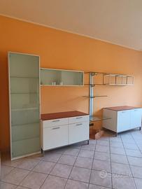 Parete attrezzata per salotto composta da due mobili contenitori (120x60x76) con piano in cristallo rosso sostituibile, colonna cristalleria con vetro fumé (60x40x210) diviso in comodi ripiani di cristallo, struttura a giorno porta tutto (piano inferiore porta TV con struttura in acciaio portante copri-cavo) e mensole scorrevoli a piacere, mensola a giorno in alluminio (120x25x32), contenitore con apertura a pistone e vetro fumé (120x39x35)
