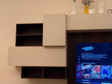 Parete attrezzata del prestigioso marchio SanGiacomo, con finiture in legno laccato opaco colore Canapa e in rovere a poro aperto termotrattato. Mobile usato, da nuovo a listino sta a 6.200€. Estremamene bello e ben tenuto, con ferramenta e cerniere di primo ordine, come usuale per la qulita del marchio SanGiacomo. Non ha nulla a che vedere con i mobili impiallacciati in formica che si vedono solitamente in vendita. Qualità superiore, finiture in vero legno. Il TV in figura (65’’) e altri oggetti di arredo non inclusi. Occasione.
