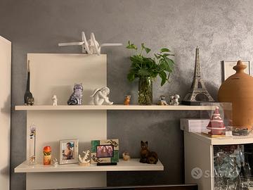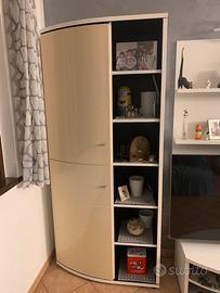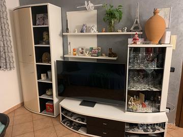 Vendo parete attrezzata moderna composta da mobile basso curvo porta TV, colonna/libreria, vetrinetta e mensole.