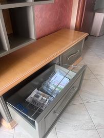 Vendo per trasloco, parete attrezzata per soggiorno composta da una vetrina, un pensile a cubotti e un mobile a terra con due amoi cassettoni. Misure in foto. Lievi imperfezioni su alcuni bordi ma in perfetto stato. Smontaggio e trasporto a carico di chi ritira. Zona Morena