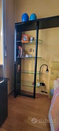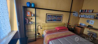 Parete attrezzata sopra letto matrimoniale; composizione a muro per letto matrimoniale; laccata nera con ripiani in cristallo; cassetto a scomparsa; porta riviste; punti luce NON compresi.
