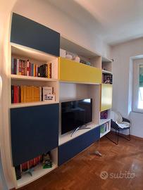 Composizione Novamobili ideale per arredare la zona giorno. Moduli a giorno o con ante a ribalta e rialza con sistema push pull, finitura in pannelli agglomerati di legno, nobilitati e laccati. Misure: L.244xP.35(senza sportello)xH.194