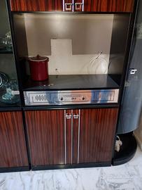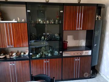 Elegante parete attrezzata da soggiorno in stile anni '70 con dettagli effetto radica e finiture nere.