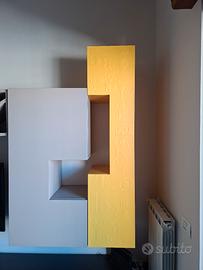 Pensile decorativo: giallo senape laccato, 35x40x150 cm, bassorilievo lettere/numeri con basi interne.