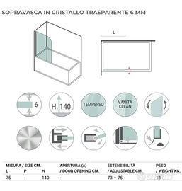 Parete sopravasca 75 cm girevole altezza 140h cm in cristallo temprato trasparente anticalcare. Mai installata, come nuova. Vendo perché misure sbagliate. Ancora in confezione. Tutte le informazioni sul sito di Deghi, codice articolo KVE75.