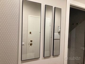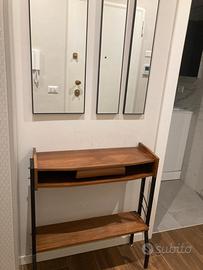 Vendo parete da ingresso composta da: - consolle stile nordico anno 50. misure 76(larghezza)x26(profonditá)x85.5(altezza) - set di n.3 specchi artigianali con cornice in metallo nero, misure 30x90x2 e 14.7x90x2 - Armadio su misura con appendi giacche e porta aspirapolvere, marca Spagnol, misure 35.7x136x195(altezza)
