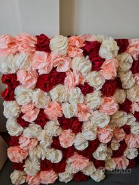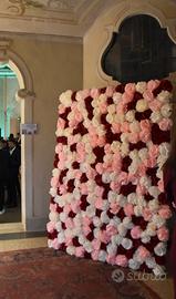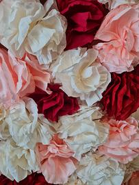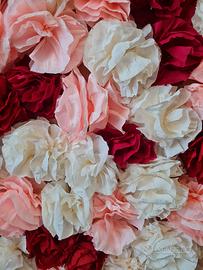 Parete decorativa fatta a mano con fiori in carta crespa sulle tonalità del rosa, panna e bordeaux. La parete si compone di quattro comodi pannelli smontabili che sono facilmente assemblabili insieme e quindi facilmente trasportabili. L'abbiamo usata per il photo boot del nostro matrimonio!
