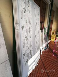 Parete mobile separatoria autoportante su ruote, con possibilità di fissaggio a muro da un lato. Si apre e chiude a soffietto scorrendo su ruote. Utile per l'ufficio o l'abitazione, ottima copertura della visibilità per la massima privacy. Misure: 7 pannelli mobili h200xL65 per un totale di 455cm. In foto e' ancora presente una pellicola decorativa Floreale facilmente rimovibile perché non incollata. Pareti in plexiglas bianco e bordi grigio chiaro. Pagato 1500€ nuovo