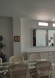 Tavolo in legno laccato bianco e vetro, con 6 sedie abbinate con seduta di stoffa (regalo se serve stoffa di ricambio per usura nel tempo)+ vendo parete giorno spaziosa e mobile tv.