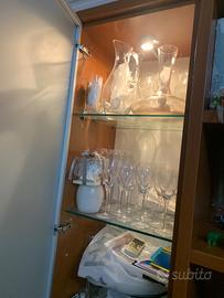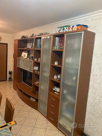 Mobile salone larghezza 3,50 e alto 2,20 in ciliegio e misto vetrine apribili con mensole in cristallo, luci all’intetno delle vetrine, cassettiere, modulo con anta laterale scadfalato, scomparti pwr libri e vtrina centrale pirta liquori.con smontaggio, trasporto e montaggio € 500, solo vendia mobile € 200