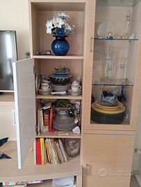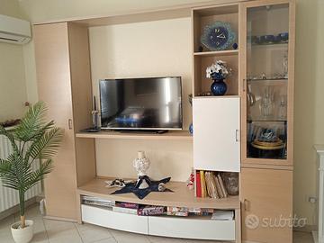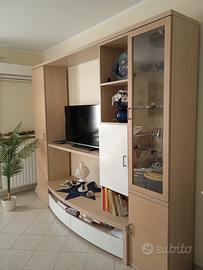 Vendo parete soggiorno come da foto completa di due ampi e profondi cassettoni. Colore rovere sbiancato e bianco opaco. Sulla vetrina è collocato in alto un faretto che consente di offrire una luminosità all' interno dei ripiani in vetro. Lunghezza MT 2,70 profondità cm 40 e circa cm 50 nella parte centrale (cassettoni) Acquistato in mobilificio. Smontaggio e trasporto a carico dell' acquirente.
