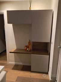 Parete soggiorno Giessegi, colore grigio opaco con mensola e vano a giorno colore noce scuro. In ottime condizioni, solo piccola crepa nel top che si vede in foto. Ritiro a mano