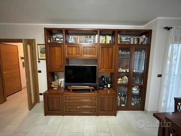 Parete soggiorno classica in noce Bassano. Possibilità di invertire la vetrinetta. Dimensioni: cm 300 x 240 (l-h)