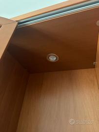 -colonne verticali con mensole a giorno, cassetti, un’anta e vetrina curva illuminata