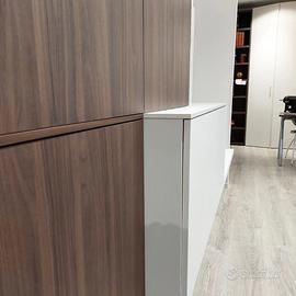 Composizione soggiorno ditta ORME in laminato color grigio chiaro opaco ed effetto venato noce scuro con doppia profondità.