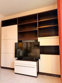 Vendo grande parete attrezzata da soggiorno in stile moderno, bicolore (struttura marrone scuro wengé e ante color panna/bianco). Il mobile fa parte di un set coordinato.