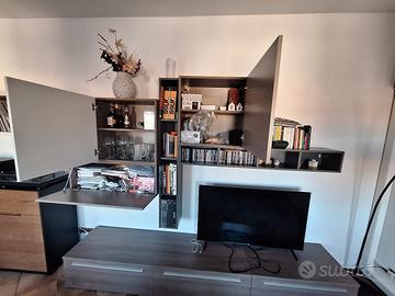 Parete attrezzata soggiorno colori noce/bianco e fango.