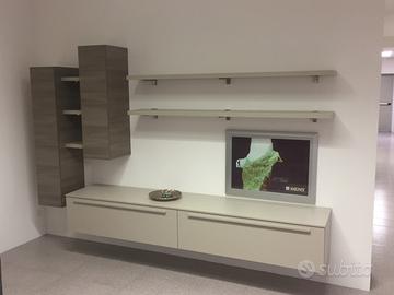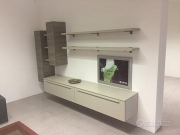 Parete attrezzata porta TV blocco con basi sospese apertura a ribalta largo 240 cm profondo 47 cm.