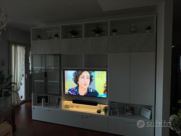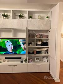 Vendo a malincuore per lavori a casa parete attrezzata in legno massello bianco effetto legno (pagata 4100€) con luce led a sfioro. Vetrina con telaio satinato; cassonetti scorrevoli ed il centrale ad anta.