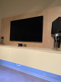 Parete tv composta da pannello color legno dove appendere tv. La tv in foto è un 50”. Tutti i fili passano nel retro e danno alla stanza pulizia ed estetica. Sono presenti due ampi cassetti con apertura push-pull in bianco . Sotto la parete e’ istallata una fila di luci led per illuminare le vostre serate cinema. Prezzo leggermente trattabile