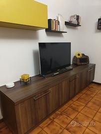 Comprende porta tv con tre cassettoni molto capienti, 2 mensole (misura L60xP17) e un pensile (misura L90xH36xP33).