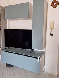 La parete TV ha i frontali ed il piano TV laccati colore azzurro polvere con finitura opaca e la struttura è bianco opaco ruvida.