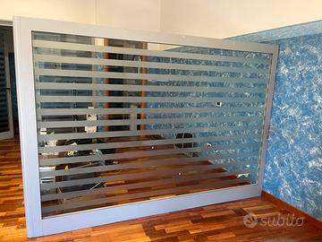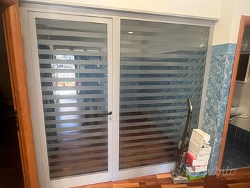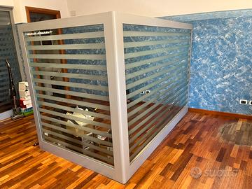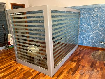Vendo pareti divisorie con struttura in alluminio e vetro temperato satinato a fasce orizzontali.