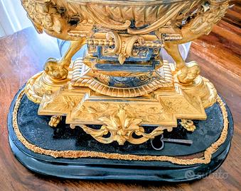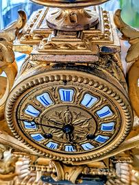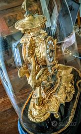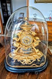Parigina, orologio antico d’appoggio in bronzo dorato del XIX secolo ('800), con base e campana in vetro.