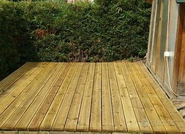 Stock di parquet per esterno in essenza in legno Pino trattato per esterno, misure 19(spes)x90(largh)x 2000/4000 (lungh)mm con relativa sottostruttura e viti necessari per il montaggio; ideale per la posa in terrazzo o giardino in esterno.