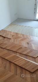 Tavole in rovere Spazzolato verniciato, taglio spina ungherese 60°. Adatto sia per posa flottante che incollata. Spessore tavola 14mm con strato nobile di 3 mm. Sono disponibili 52 mq, vendo il lotto intero. Dimensione del singolo listello cm 7x23. Il prezzo di intende per metro quadrato.