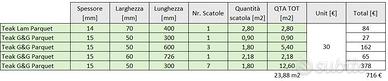 Disponibilità di 23 metri quadri in listoni con spessore 14 mm (2,80 mq) e 15 mm (21,08 mq) = 716 euro totali.